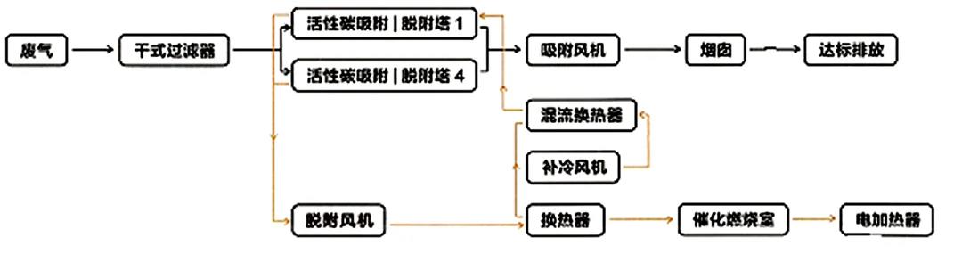 當(dāng)活性炭吸附飽和后再利用熱風(fēng)將有機(jī)廢氣從活性炭上脫附出來,使得活性炭得到再生;脫附出的有機(jī)廢氣被送往催化燃燒室(CO)進(jìn)行催化氧化,有機(jī)物被高溫氧化成為無害的二氧化碳和水。