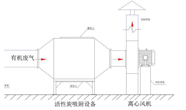 有機廢氣氣體由風(fēng)機提供動力,正壓或負(fù)壓進入活性發(fā)吸附箱內(nèi),由于活性炭固體表面上存在著未平衡和未飽和的分子引力或化學(xué)健力,因此當(dāng)此固體表面與氣體接觸時,就能吸引氣體分子,使其濃聚并保持在固體表面,污染物質(zhì)從而被吸附,廢氣經(jīng)過濾器后,進入設(shè)備排塵系統(tǒng),凈化氣體高空達標(biāo)排放。